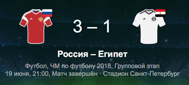 Сборная России побеждает второй раз подряд на групповом этапе чемпионата мира, обыграв сборную Египта со счетом 3:1.