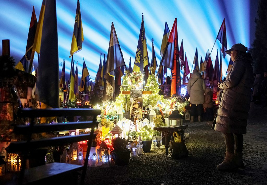 People visit the graves of their relatives, who were killed during Russia's attack on Ukraine, during a large-scale light installation "Lights of Memory" as they mark the third anniversary of the full-scale Russian invasion, at the Lychakiv cemetery in Lviv, Ukraine February 23, 2025. REUTERS/Roman Baluk TPX IMAGES OF THE DAY