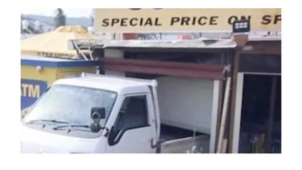 На кадрах с камеры видеонаблюдения видно, как грузовик с одним человеком внутри, двигаясь задним ходом, врезался в передний фасад магазина. Затем видно, как мужчина в капюшоне выходит из грузовика и идет к кассе.
