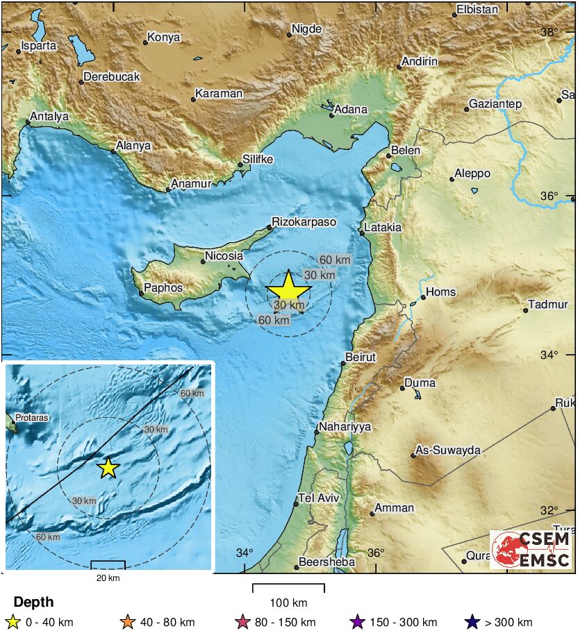 По данным Европейско-средиземноморского сейсмологического центра (EMSC), эпицентр землетрясения находился в 75 км к юго-востоку от Фамагусты.