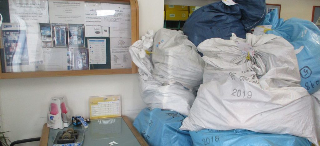 В небольших отделениях, таки[ как Kapsalos и Ayios Ioannis, лежат огромные мешки с неразобранной почтой и опаздывают с на 2 недели.