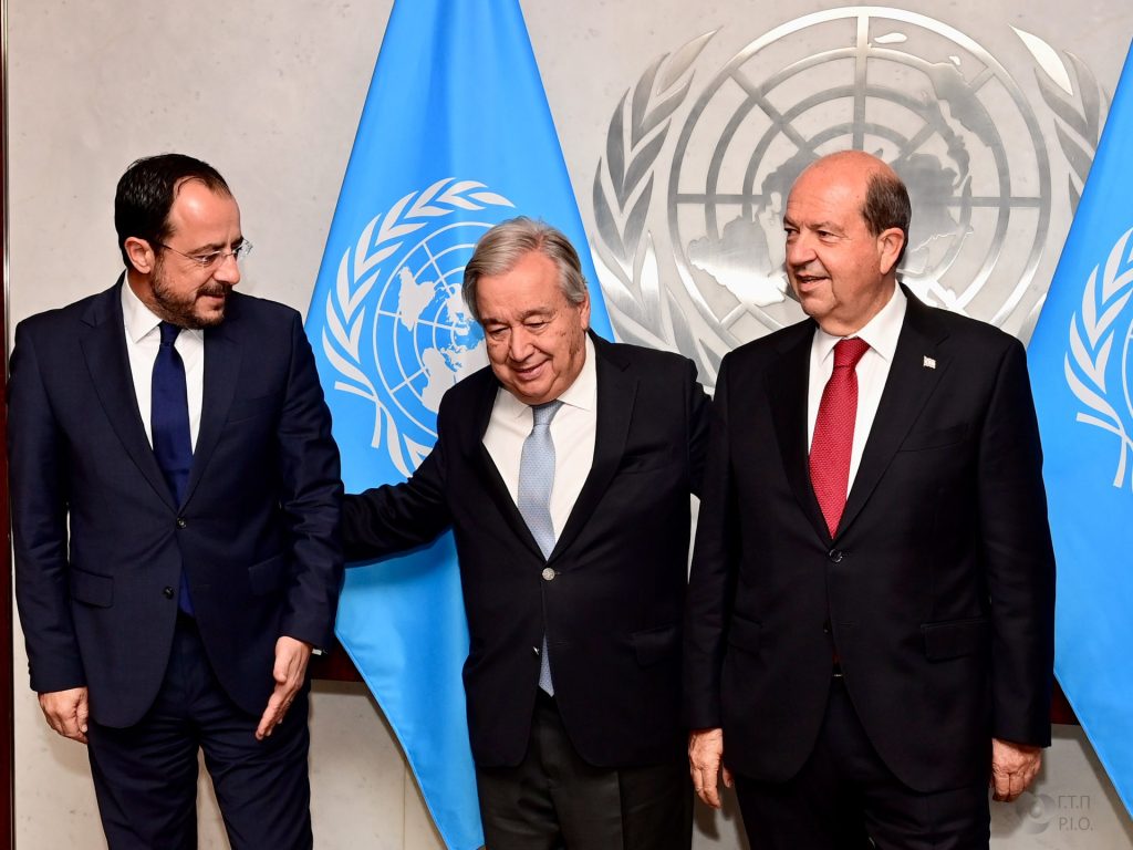 Πρόεδρος της Δημοκρατίας ‒ Τριμερής συνάντηση με Γενικό Γραμματέα Ηνωμένων Εθνών και ηγέτη Τουρκοκυπρίων Έδρα των Ηνωμένων Εθνών, Νέα Υόρκη Ο Πρόεδρος της Δημοκρατίας κ. Νίκος Χριστοδουλίδης σε τριμερή συνάντηση με τον Γενικό Γραμματέα των Ηνωμένων Εθνών κ. António Guterres και τον Τουρκοκύπριο ηγέτη κ. Ersin Tatar. // President of the Republic of Cyprus – Tripartite meeting with UN Secretary-General and Turkish Cypriot leader United Nations Headquarters, New York The President of the Republic Mr. Nikos Christodoulides at a tripartite meeting with the UN Secretary-General, Mr António Guterres, and the Turkish Cypriot leader, Mr Ersin Tatar.