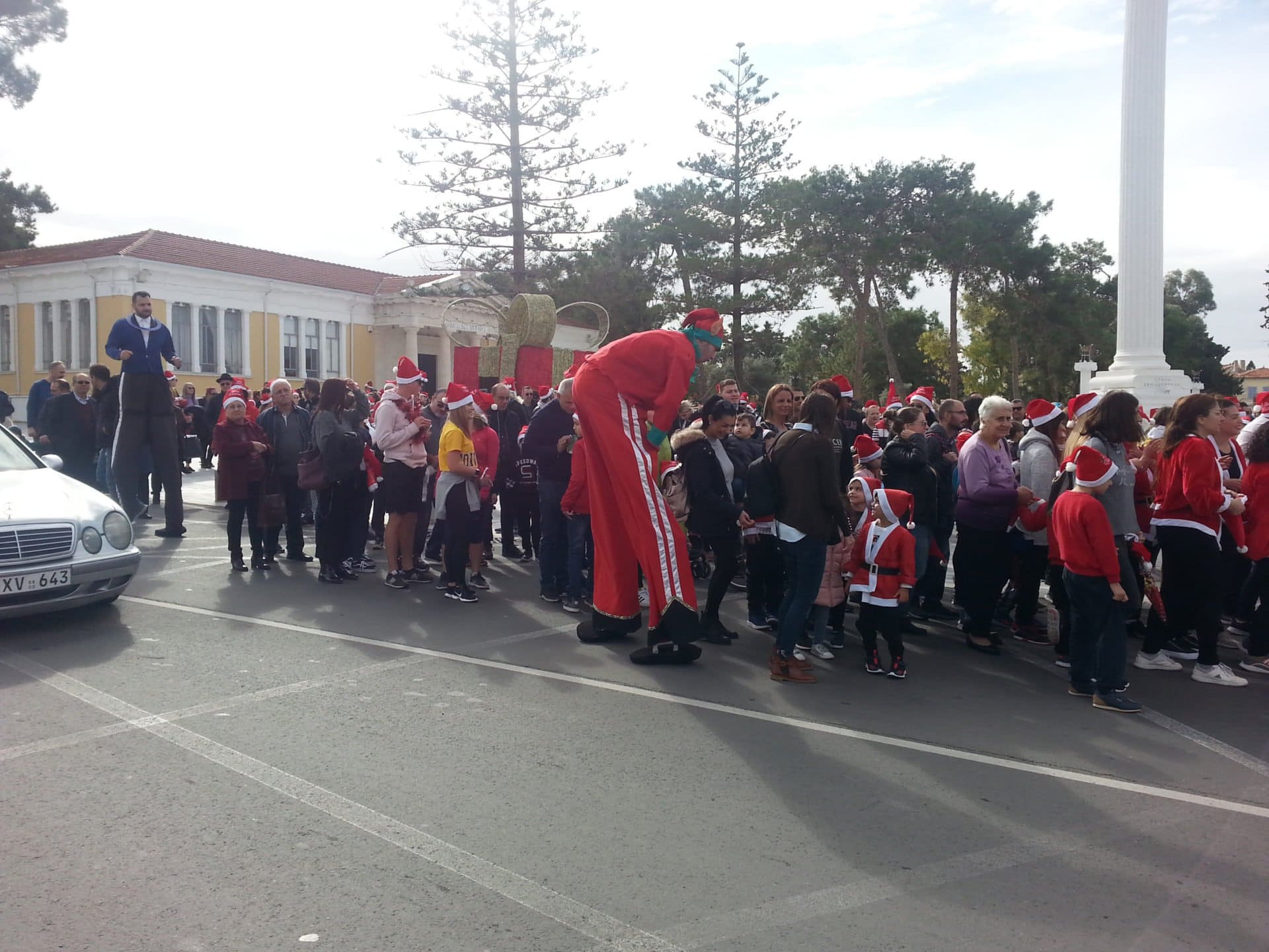 Муниципалитет раздавал бесплатные шляпы Санта-Клауса всем участникам, которые собрались, чтобы отправиться в 10:30 утра. Была также развлекательная программа с танцами и рождественскими песнями.
