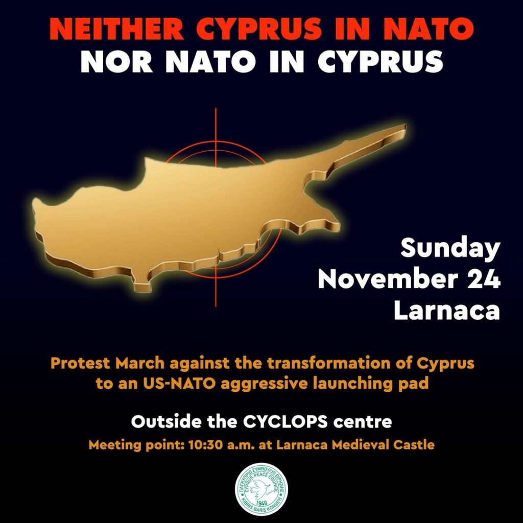 Протестующие соберутся у средневекового замка Ларнаки в 10:30 утра, а организаторы призывают активистов движения за мир и организованные группы присоединиться к демонстрации, требуя немедленного вывода войск США с Кипра и прекращения военного сотрудничества США и Кипра.