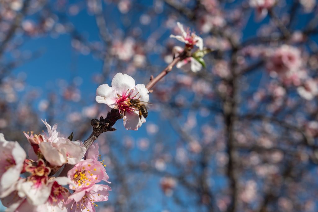 Almond flowers with a bee pollinating them. Pink almond blossom closeup on blue sky background on a sunny day. Spring nature wallpaper. Tenerife, Canary islands, Spain.