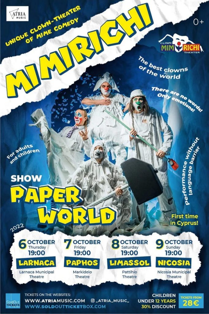 Театр пластической комедии «МИМИРИЧИ» завоевал мировое признание, гастролируя более чем в 45 странах мира – их яркие постановки увидели зрители Европы, США, Южной Америки, Японии, Германии, Азии и других стран. А теперь он выступит на Кипре с легендарным шоу для взрослых и детей «Бумажный мир», веселой, азартной и увлекательной постановкой, рассказанной универсальным языком мимики, пластики и жеста.